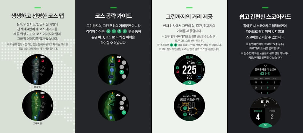 - 핀 디렉션 : 그린까지 공략 방향을 워치 내 콤파스 기능으로 확인 가능